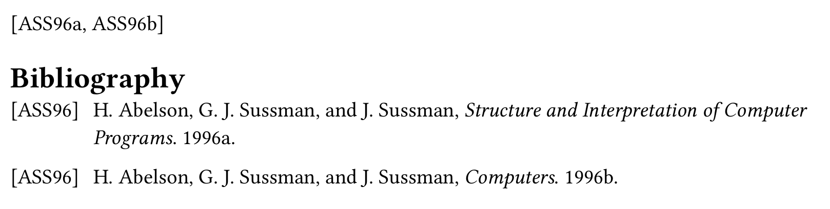 Here, the bibliography labels themselves are disambiguated as [ASS96a] and [ASS96b].