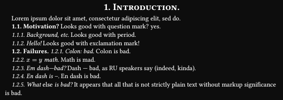 I would like to automatically append a period to every heading in this example document, except when the content already ends with a conflicting sentence-terminal punctuation mark ([.?!:]). My current code with help from posters on How to control whitespace before and after run-in headings works only when the heading contains no math, markup, etc. or even a colon: