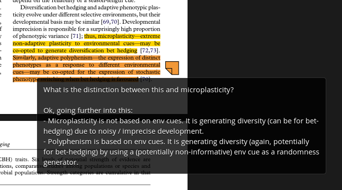 For example in the image above, the transparent black box with comments only appears after hovering over the sticky note. In this case I’m viewing a PDF in evince, while the comments and highlight were made with Zotero.
