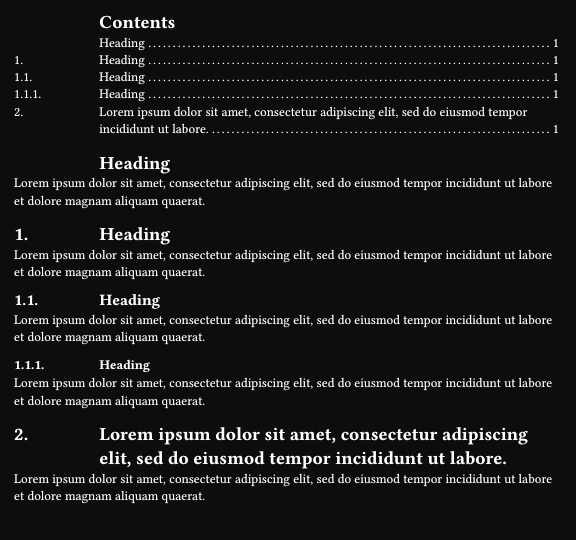 I would like to achieve that the text of a heading, regardless if there is a number or not, always would be placed 2.5cm from the left margin. If possible, this also should apply to the table of contents.