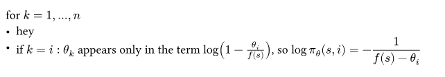 - if $k = i:$ $theta_k$ appears only in the term $log (1-theta_i/f(s))$, so $display(log pi_theta (s,i) = -1/(f(s)-theta_i))$