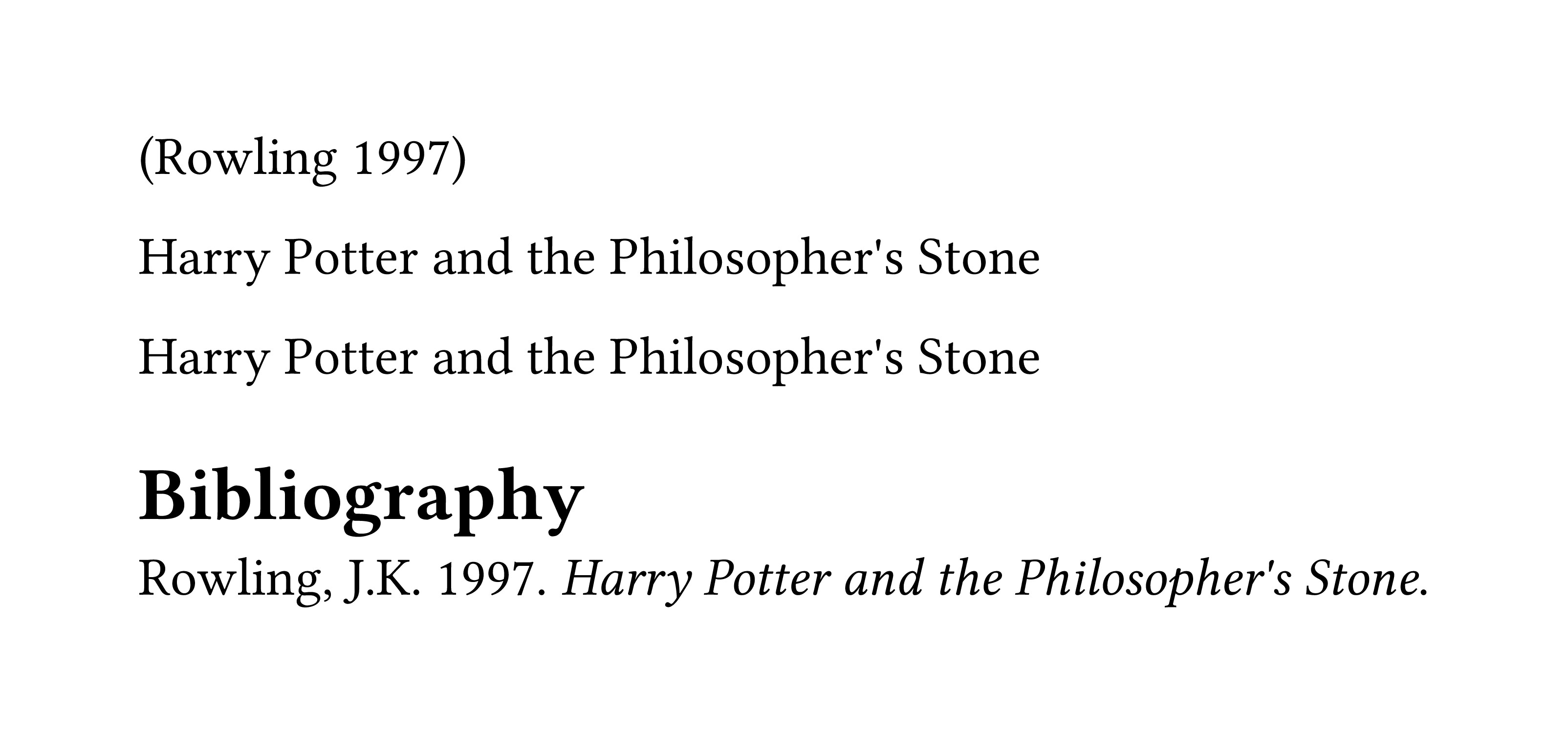 Essentially, I want to “extract” the title field from the bibliography entry to use it as a noun in the sentence itself, rather than having Typst generate the parenthetical citation. Is there a way to access the title property of @harrypotter directly? Note that this is only for entries I choose to render this way, otherwise the citation should work as it is.