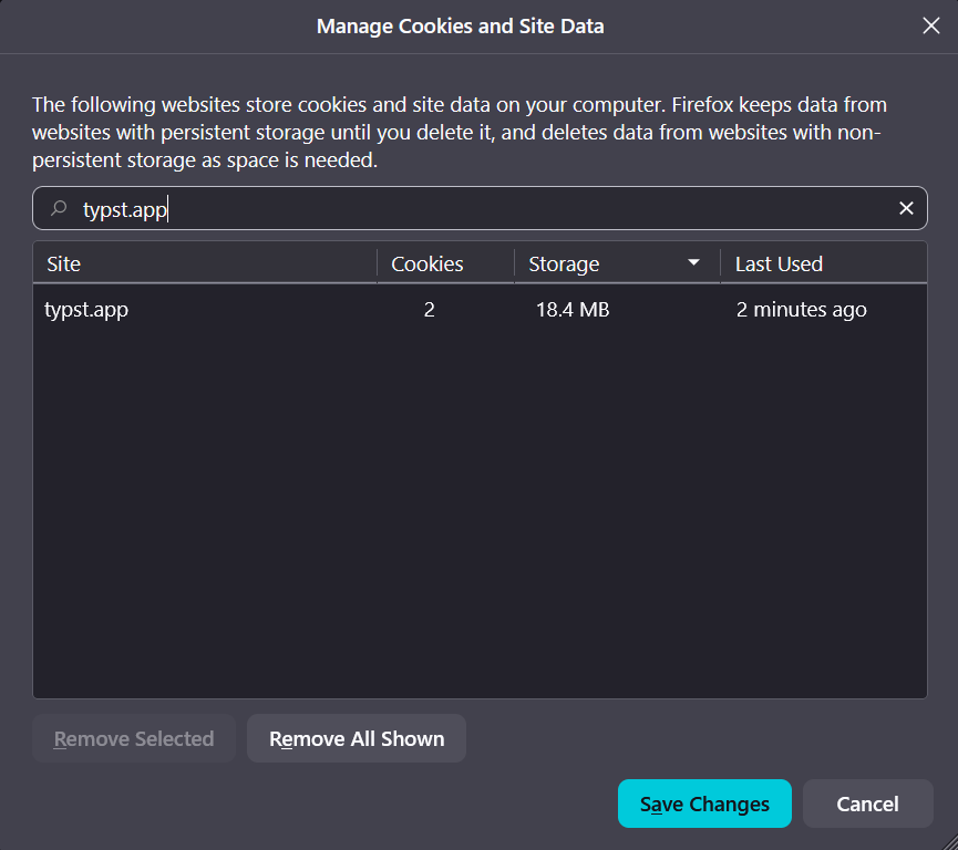 A bit drastic, but clearing the cookies for typst.app has done it for me in Firefox.