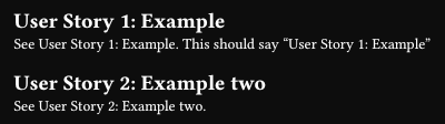 See #heading-text(<us-example>). This should say "User Story 1: Example"