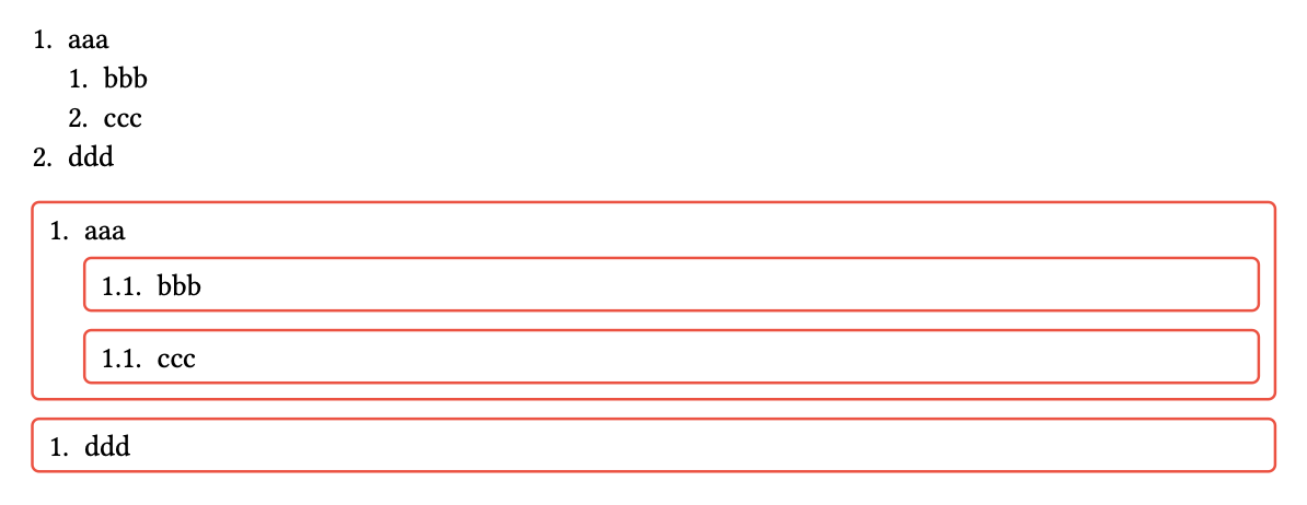 Which yields this below (surprisingly to me, the numbering is also now broken). Why is that, and can I enclose just the content/body of each node?
