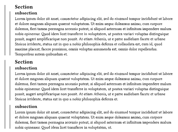 I would like the draw lines along my sections in my document in the margin and add text/label to them. I’ve tried something using blocks to show what I would like to have, but it seems a bit hacky and I don’t see how to add text to it until now.