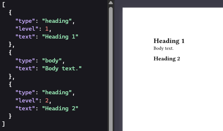 In Rust, I have a simplifies AST representation of a RTF document. With heading (with different levels) and body paragraphs, and bold and italic text. I want to render this as part of a larger Typst document, in which I use sys.inputs to import values for rendering.