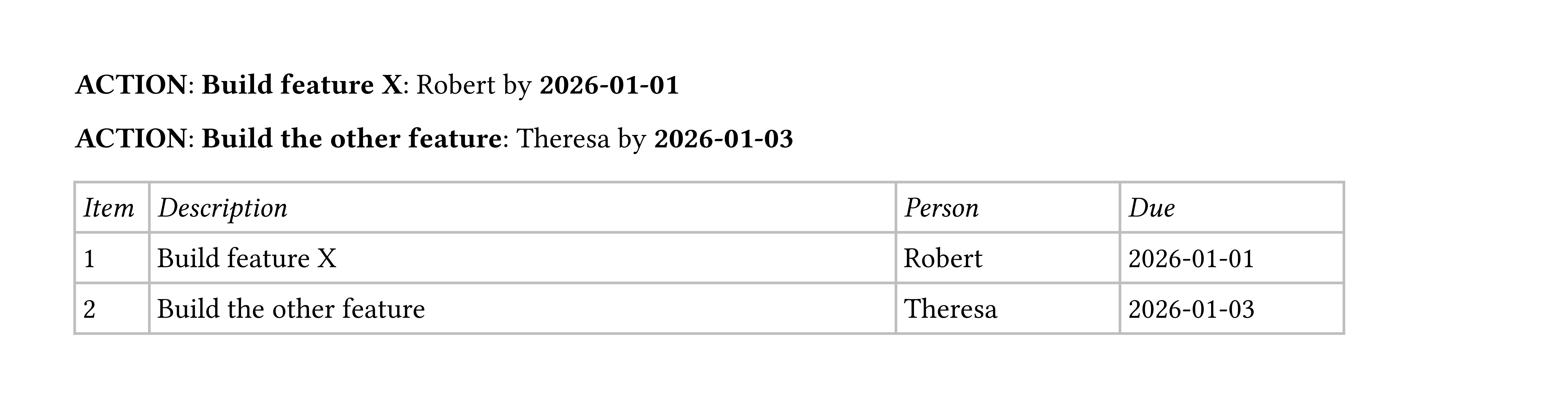I am 90% through to a Typst template that would allow me to capture an engineering meeting summary. We use a specific format to highlight individual inline action items that seems to be making it harder to generate a summary table.
