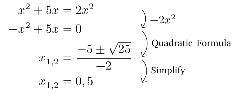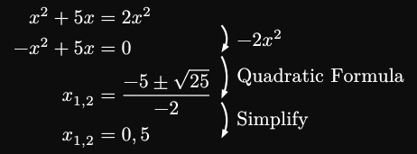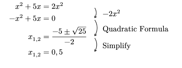 -x^2 +5x&=0\Arrow{Quadratic Formula}\\