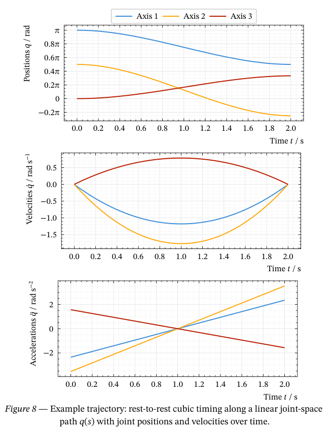 caption: [Example trajectory: rest-to-rest cubic timing along a linear joint-space path $q(s)$ with joint positions and velocities over time.],