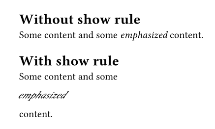 As can be seen in the image, the part using the emph show rule appears to behave like a block, which I don’t want. I’d like it to be in-line, just as normal emph text would be.