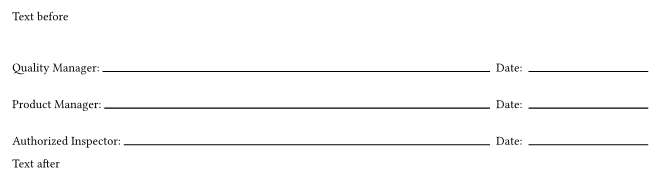 I have two working options below, but both seem overly fiddly. Is there a simpler way or a package for adding signature and date lines to the bottom of a document? I may need more than one set on occasion.