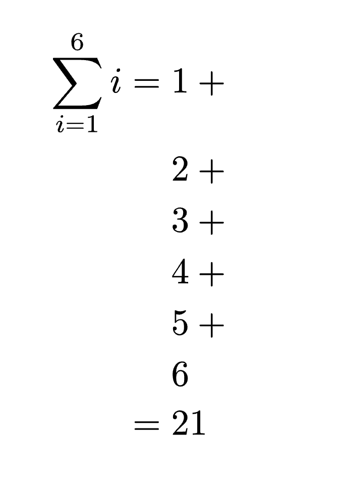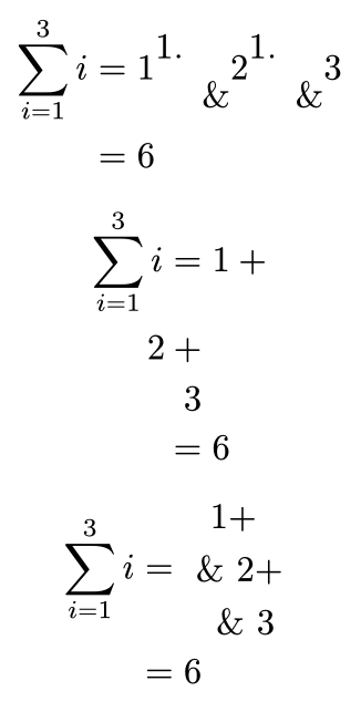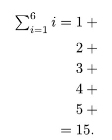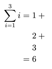 $ sum_(i=1)^3 i =& #range(1, 4).map(it => str(it)).join([$+$ \ $&$ ]) \