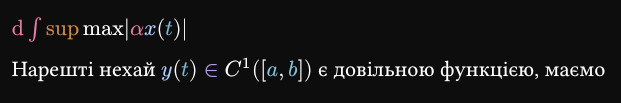 #let alpha = text(color_palette.greek, $alpha$) #let integral = text(color_palette.greek, $integral$) #let dif = text(color_palette.greek, $dif$) #let sup = $op(text(fill: #color_palette.operator, "sup"), limits: #true)$ - Use