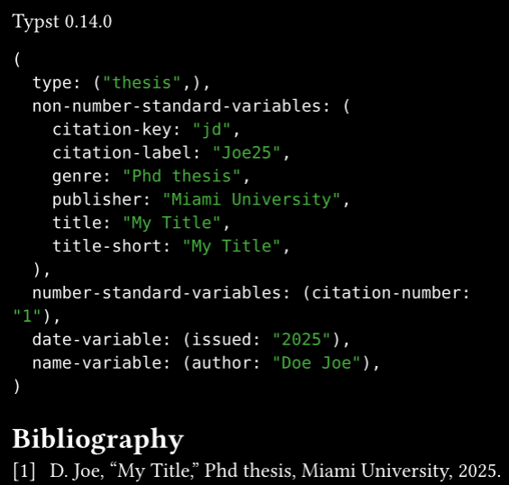 Typst 0.14 correctly shows all entries (including TYPE) except SCHOOL, which you need to replace by PUBLISHER as indicated above.