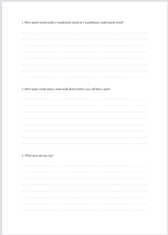 If I’m making an exam, and I want three questions on the page, each with dotted lines beneath for the answers, I might do something like this:
