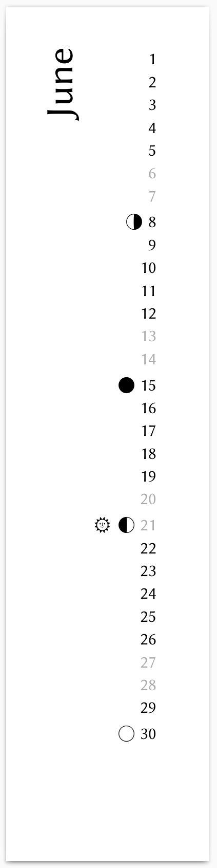 I try to replace the LaTeX generator for my photo calendar template by a typst version. So far I managed to implement a vertical strip of dates, with the weekend days having different color, and to read moon phases and solstices from a json file to mark the resp. days by symbols. It looks like this: