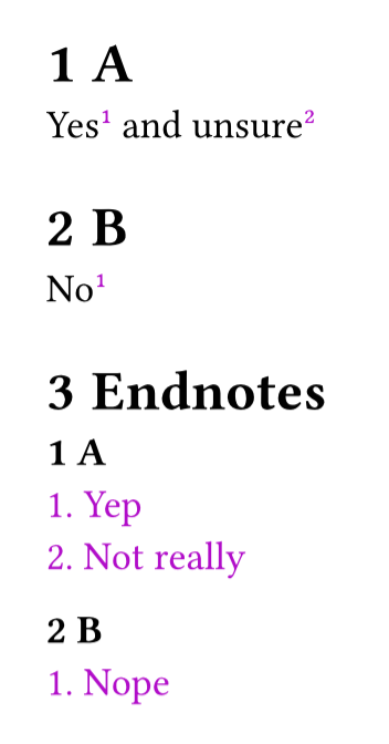 I’ve slightly adapted this snippet that replicates endnotes in Typst but I would like to tweak it further so that the endnotes are grouped by heading, and ideally restarted numbering after each new heading.
