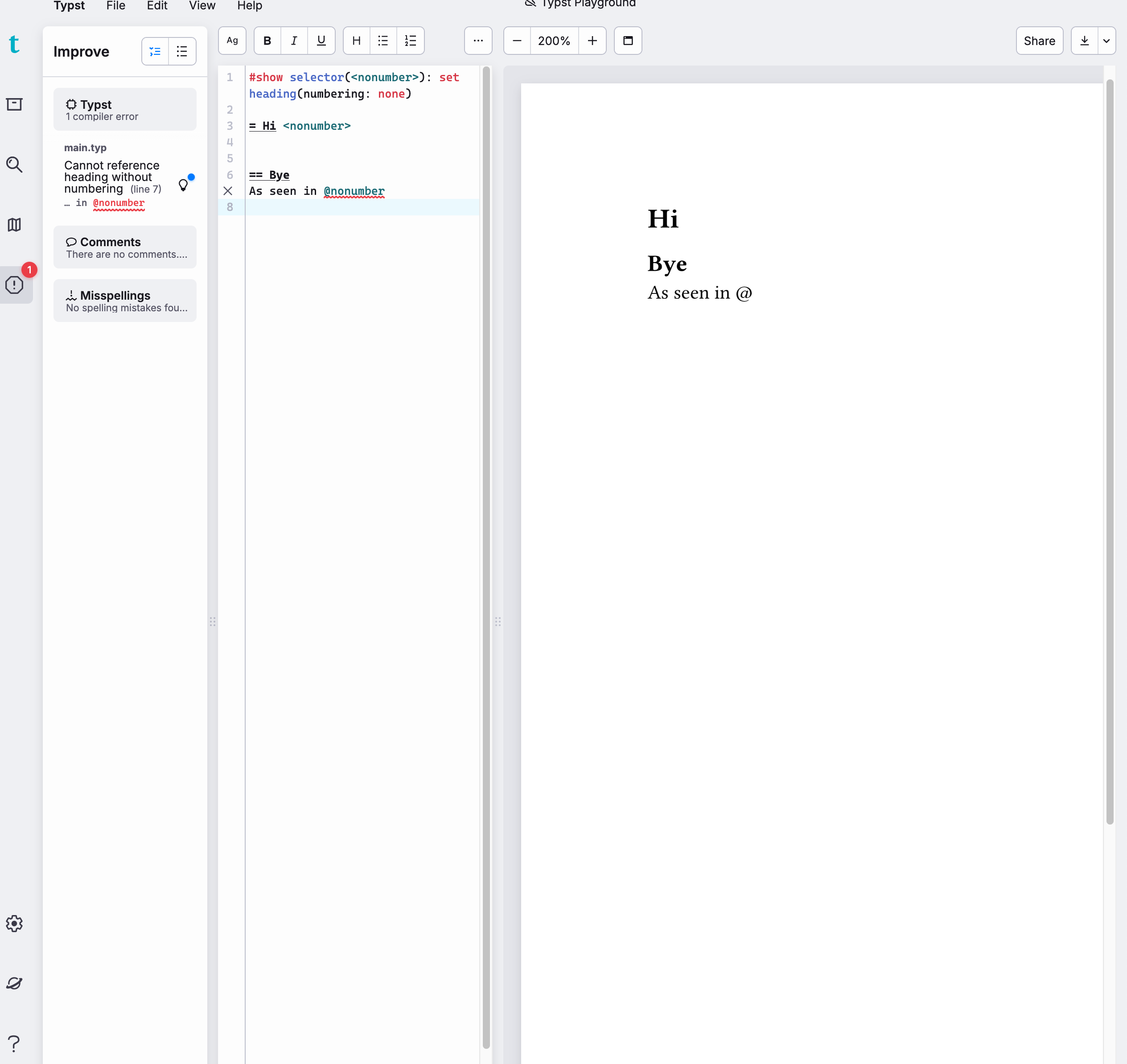 I guess if you don’t need numbering for some specific headings, then it’s a very good solution. The other one would be to do let h-no-num = heading.with(numbering: none), but it still will look verbose for non-first level headings. Or something in between: Headings without numbers in a fluent way - #2 by SillyFreak.