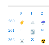 Finally, all unicode-emoji with axis, only 7 pages (A4). The result snapshot and the code: