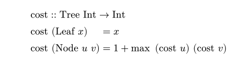 & "cost" \("Node" u" "v\) & & = 1 + max" "\("cost" u\)" "\("cost" v\) \