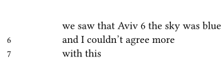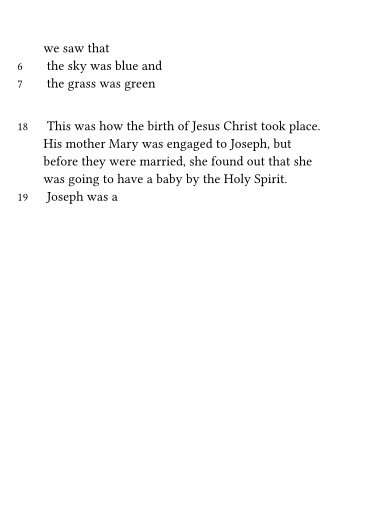 The question of what to do if say \v 6 and \v 7 are on the same line is tricky. It can be fixed manually in the TeX, but I haven’t found a good automatic solution in ConText and have just let the numbers overlap in the sidebar in an ugly manner - luckily collisions are rare.