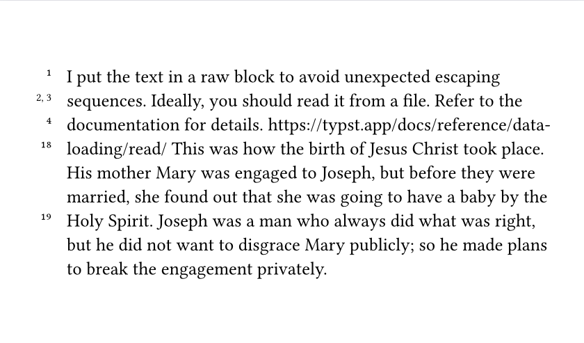 I agree that using a function is much better than trying to catch and act on the \v # pattern, but it seemed like the text would come as-is with the pattern. If that is the case then a pre-process step could easily convert a file with \v 6 style verse markers into a file with function calls (ie #v(6)) and then compile the resulting file in Typst.