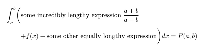 \int_{a}^{b} \splitparen{ \text{some incredibly lengthy expression } \frac{a+b}{a-b}}