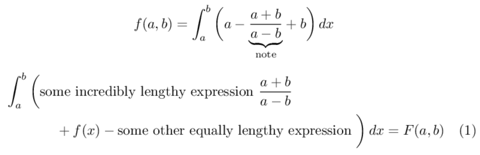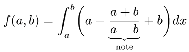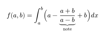 $$ f(a, b) = \int_{a}^{b} \left(a - \notebelow{\frac{a+b}{a-b}}{note} + b \right) dx $$