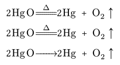 #ce("2HgO ==[$Delta$] 2Hg + O2 " + sym.arrow.t)
