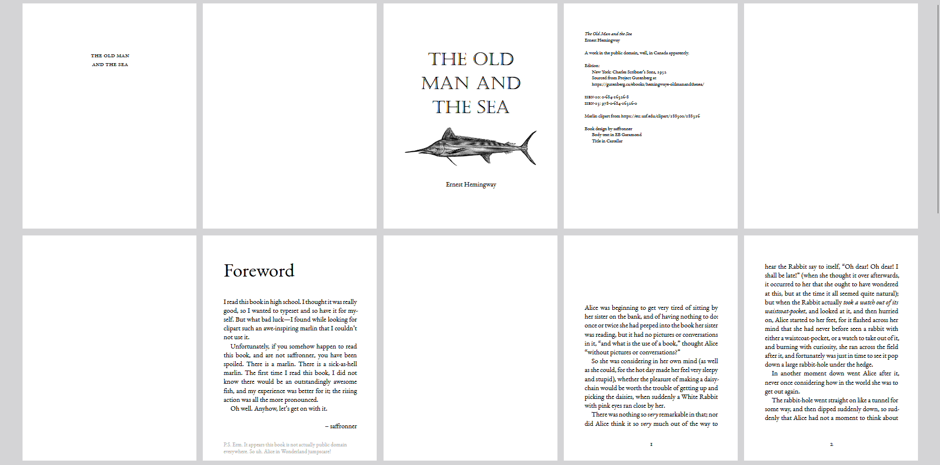 I read this book in high school. I thought it was really good, so I wanted to typeset and so have it for myself. But what bad luck---I found while looking for clipart such an awe-inspiring marlin that I couldn't not use it.