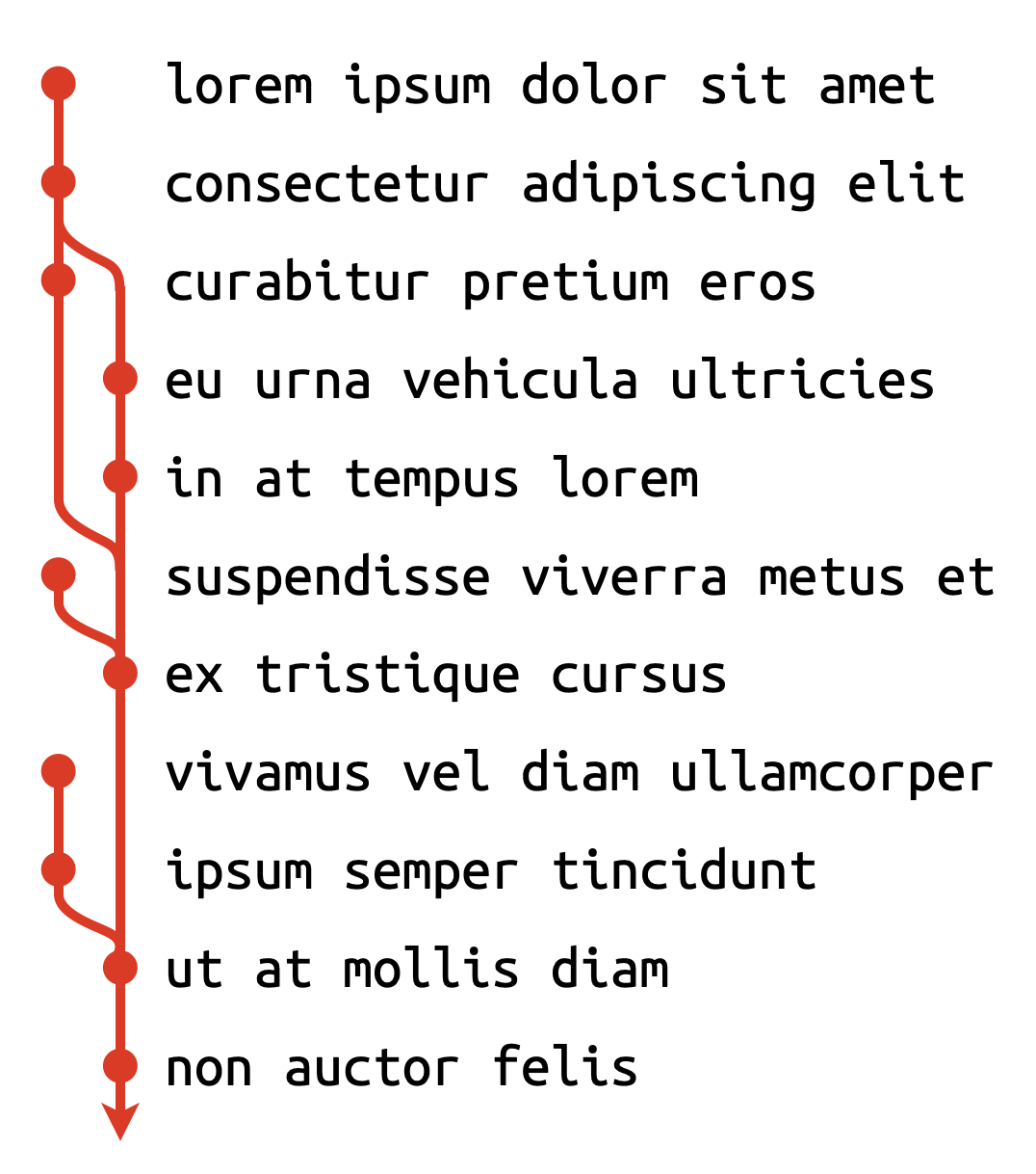 I am looking to produce something that looks like the following. The use case is to list a series of tasks with a arbitrarily complex network of dependencies. I would much prefer to have a vertical list of textual tasks (or perhaps small paragraph boxes), each with a node of some kind, and a vertical network shown on one side, rather than a “mind map” 2-dimensional network (unless it is fully automatic and very clever).