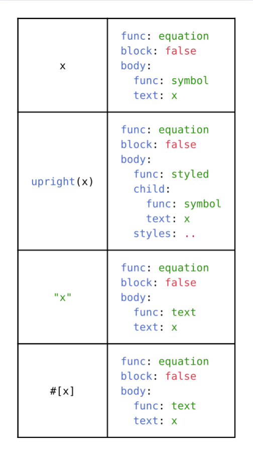 As shown in the table below, "x" and #[x] are texts, but upright(x) is a styled symbol (it.func() does not equal to std.symbol, however).