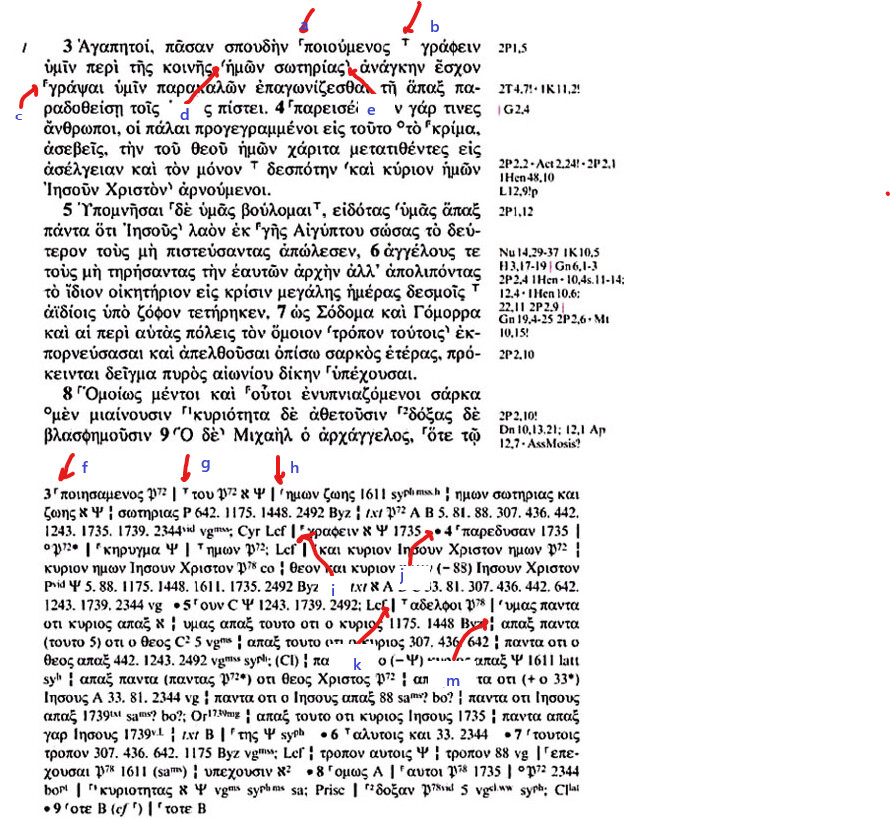 At (j) you can see a verse number in the apparatus, and a decorative middle dot that precedes it. Markers (k) and (m) show the vertical bar symbols that separate different variant units and different readings for a single variant unit, respectively.