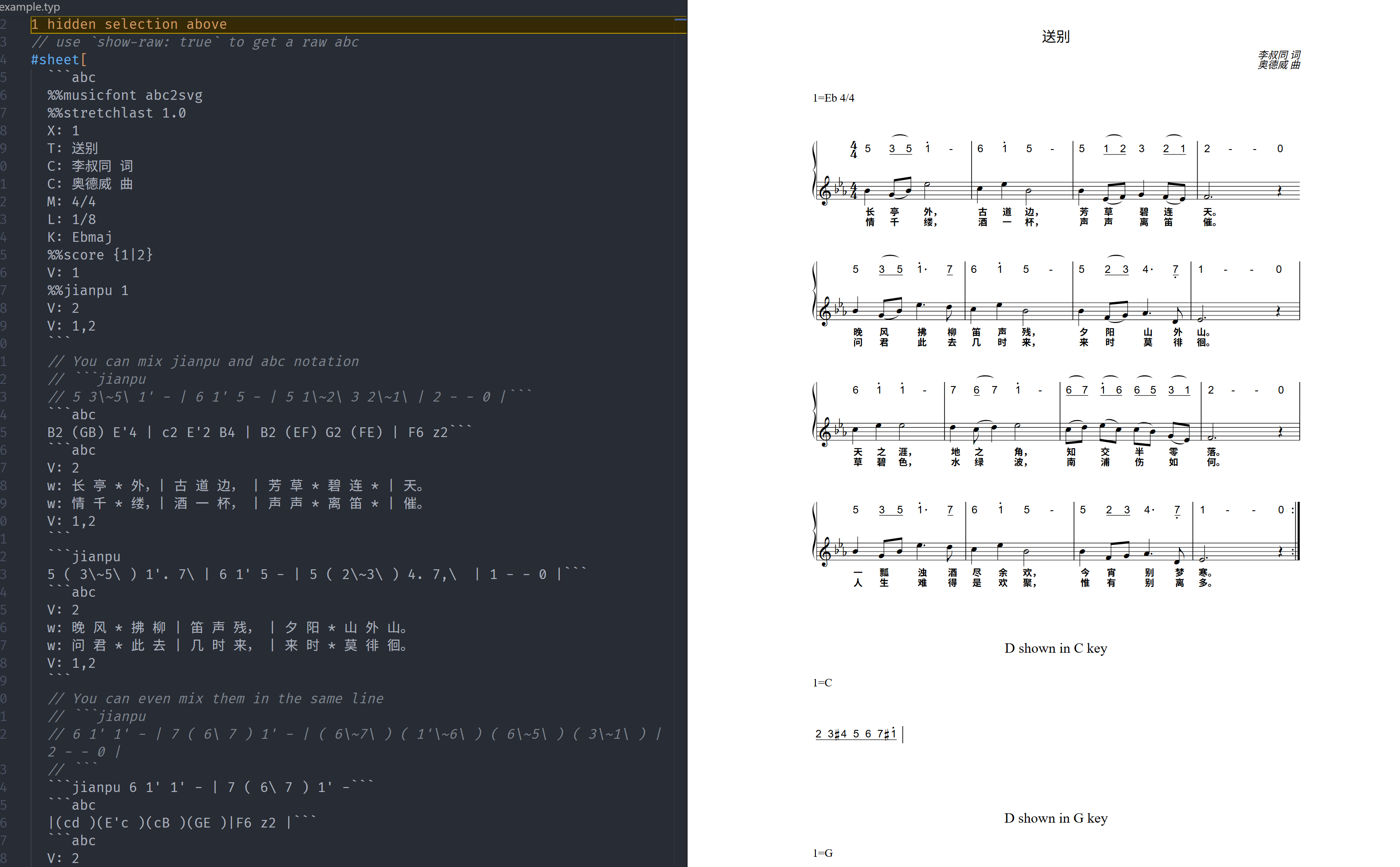 In additional to just calling abc2svg, I also added some preliminary support for parsing text jianpu notation, a popular notation in China (not rendering of jianpu, which is from the original abc2svg package).