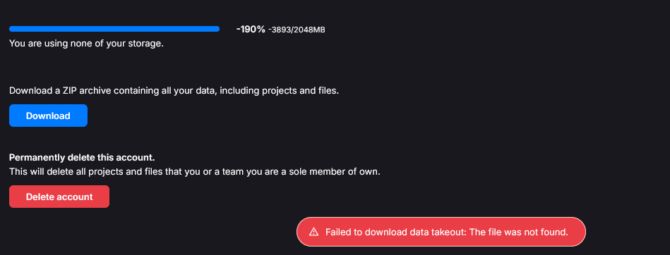 - I cannnot download my whole archive cause of the error seen in the picture. I wouldlike to dothat so that I can reset my account completely.