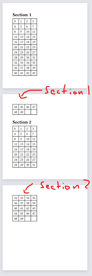 I want the heading “Section 1” to be repeated at the top of page 2 and the heading “Section 2” to be repeated on page 3.