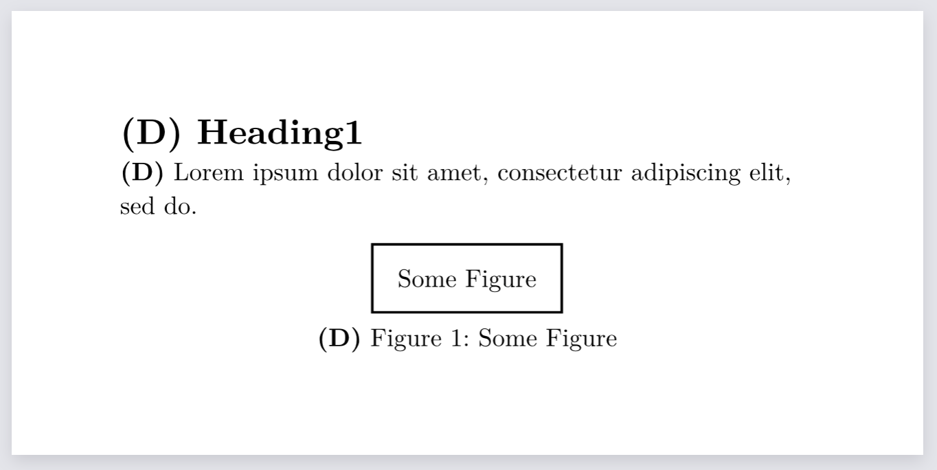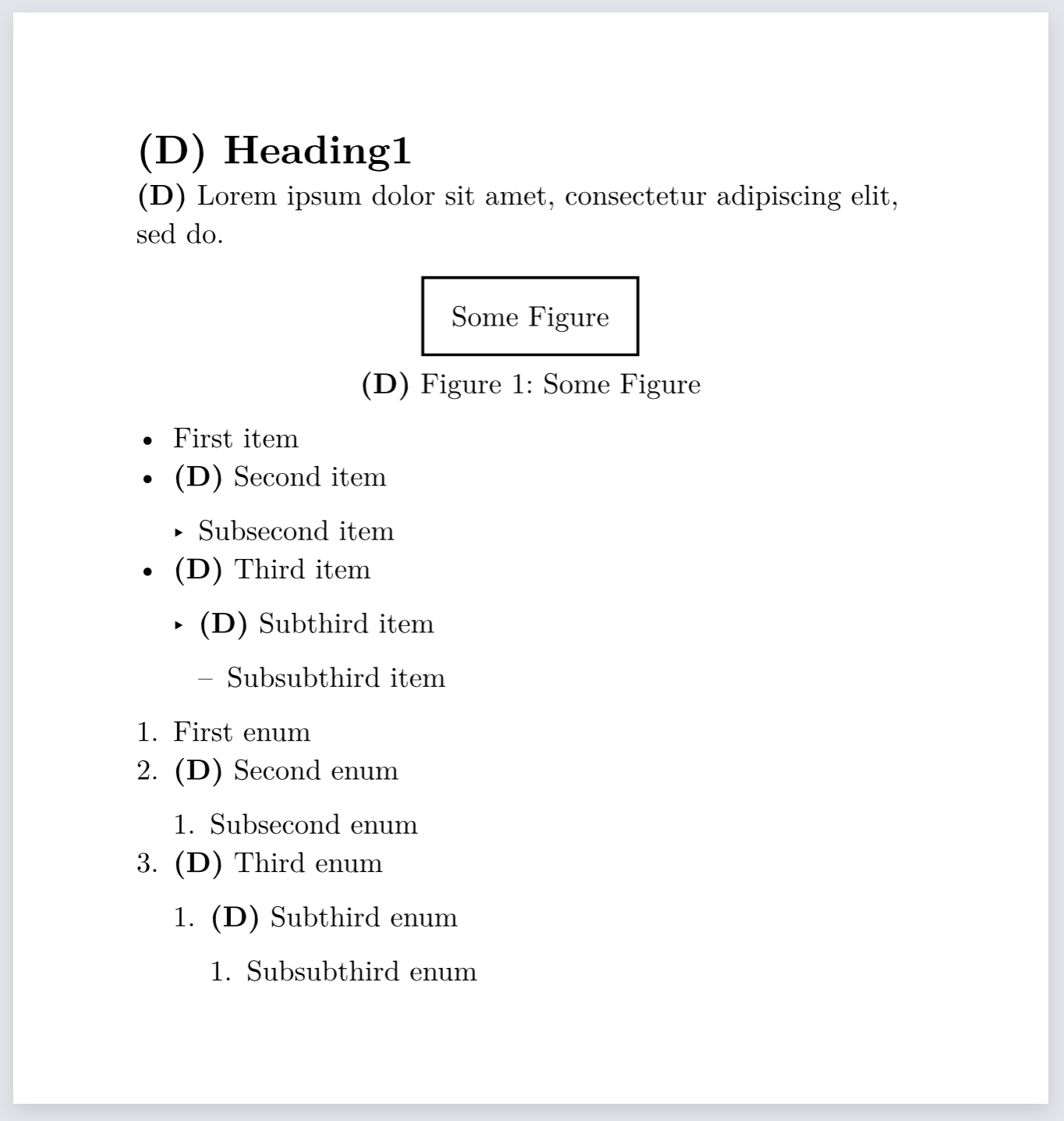 I often have to deal with documents where every heading, paragraph, list item, enum item, figure caption, really every chunk of text, has to be labeled with some kind of marker. For some element types this is totally straightforward, for some I’m left wondering if there’s a better way, and for others I have no idea how to achieve this. For headings and semantic paragraphs this is pretty easy. For this: