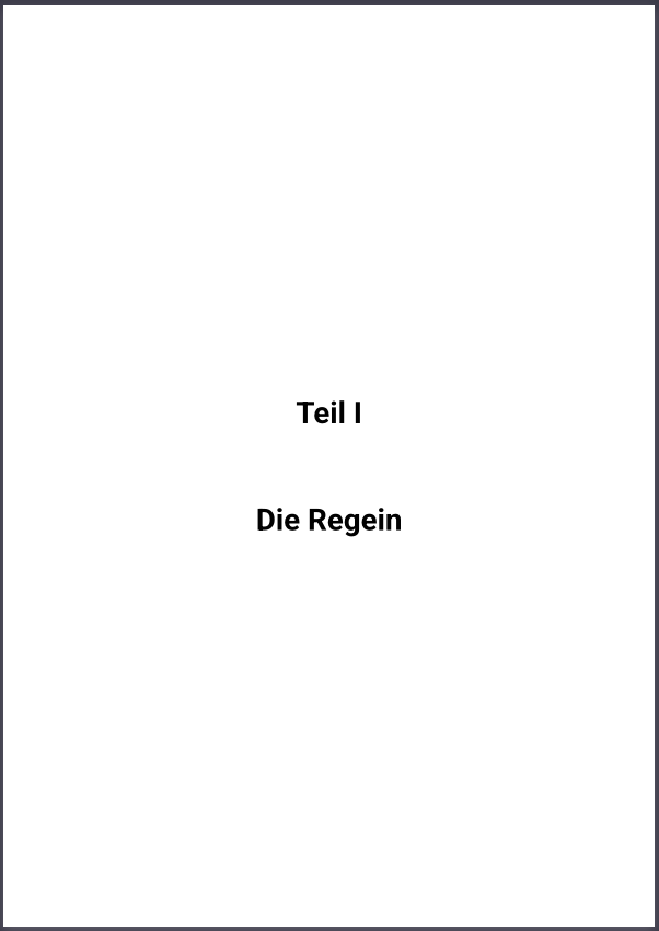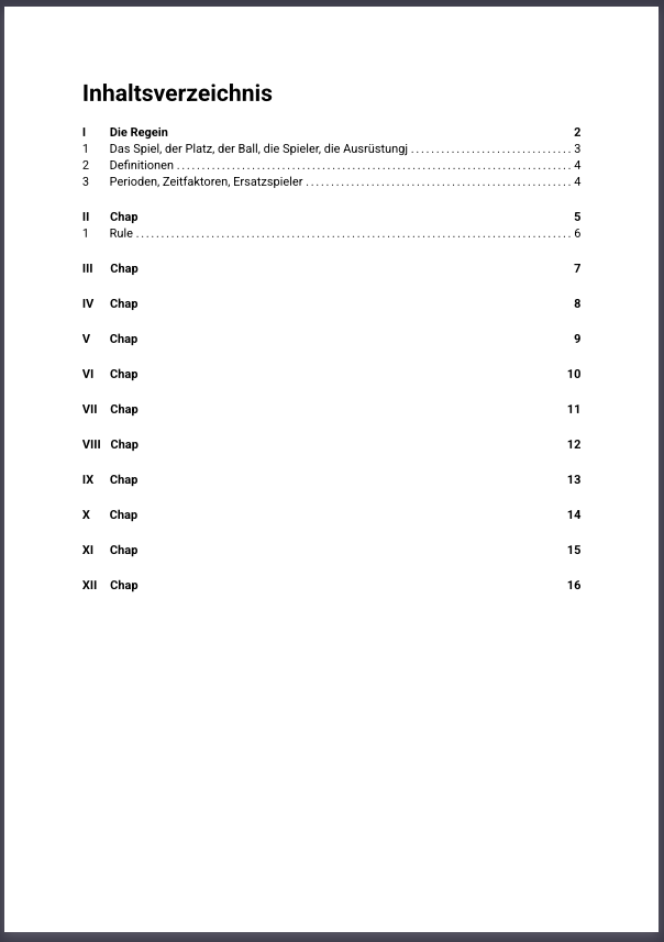 First, here are the relevant examples from the existing rulebook. In the ToC, only level-1 headings appear (primarily chapters and rules). Each chapter has a front page with the chapter number and title. The actual rules have a two-line layout (first line “Rule x”, second line the description of the rule). In the ToC, however, only the rule number and the rule description (the second line) should appear. Images below illustrate this.