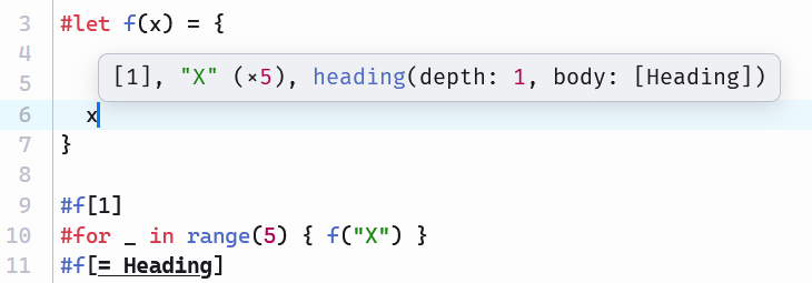 Since .fields() is only available for content types, repr can do the same thing, but for any type. Its formatted output can be put in the document, or it can be paired with panic and assert. The main difference is that panic isn’t suited for multi-line strings (which repr returns), but assert.message can handle it just fine, though you’d need to pass false as condition to always show the error. This way the document can stay clean, and the important output can stay separate, to be able to see it at a glance.