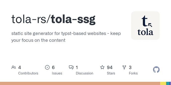 Tola is a powerful static blog generator focused entirely on content creation. It strives to be exceptionally friendly, deeply cares about user experience, and fully embraces Typst’s native syntax. It features seamless VDOM-based hot reloading and rkyv caching. Furthermore, it leverages “virtual packages” to express dynamic data and cross-post content passing using pure Typst syntax.