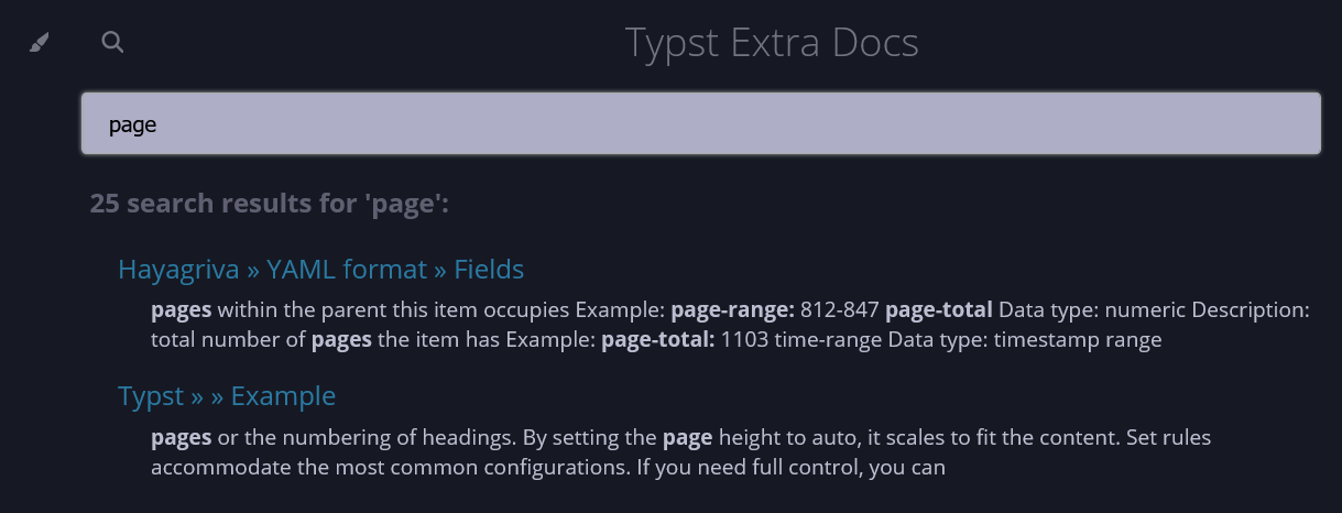 On the contrary, Typst Extra Docs uses the search function integrated in mdBook. The search result can update as you type, and is focused on docs.