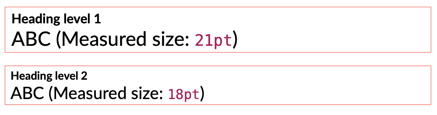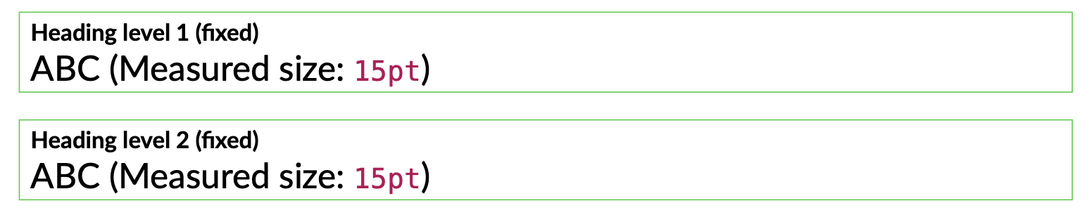 Relative sizes are scaled by the heading’s own native size. In H1 (1.4x), 1.5em becomes 21pt (1.4 × 1.5 × 10 pt). In H2 (1.2x), 1.5em becomes 18pt (1.2 × 1.5 × 10 pt).