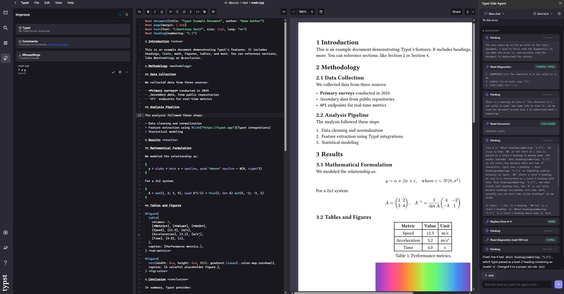 - Bundles Typst reference docs for in-agent lookup