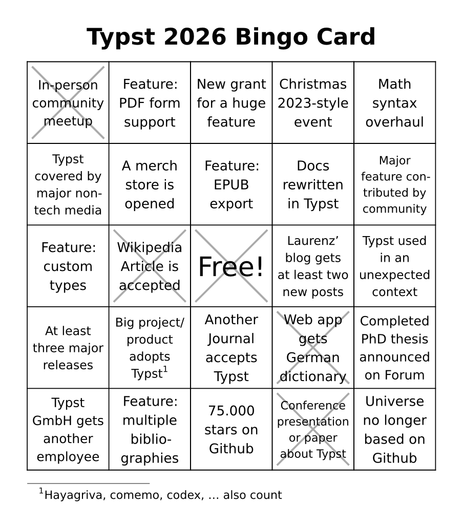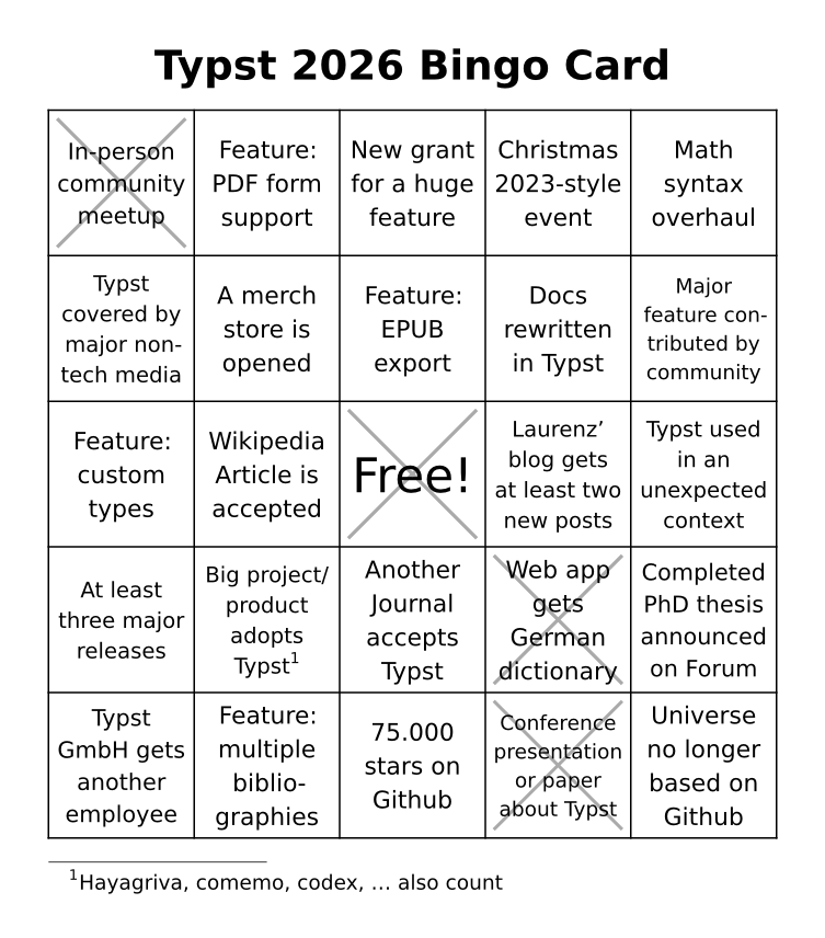This is equal parts a template you can copy if you plan to make your own 2026 Bingo card, and a whimsical unofficial Typst Bingo card. It’s too small for a Universe template, but you can simply copy the project: