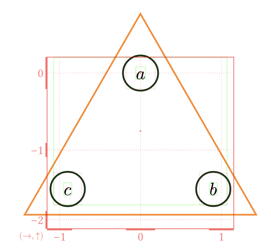 node([], enclose: (<a>, <b>, <c>), stroke: orange, shape: triangle,),