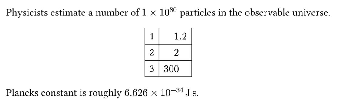 Physicists estimate a number of #num[1e80] particles in the observable universe.